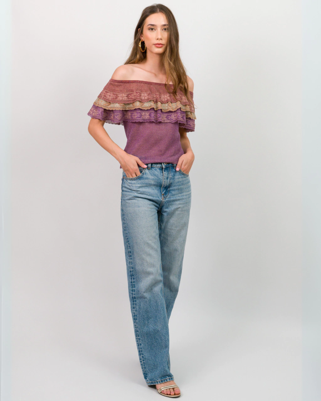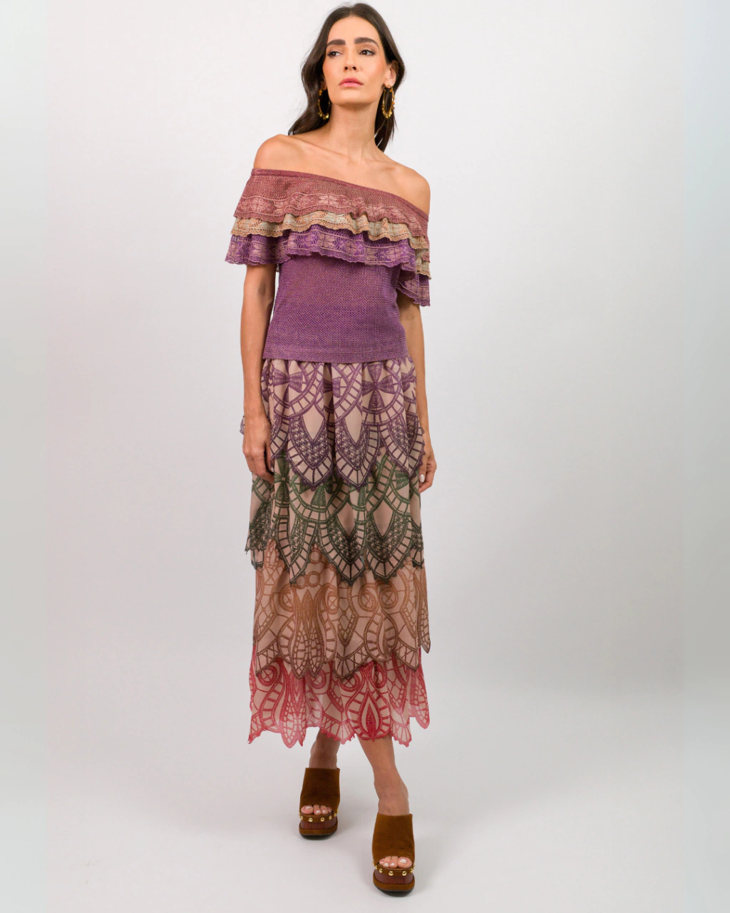 Blusa Charlote Encante-se com a Blusa Charlote, uma peça de tricot leve e fresca, perfeita para o verão. Seu design ombro a ombro revela elegância, enquanto os babados em degradê do lilás ao verde adicionam um toque sofisticado e delicado. Ideal para composições que pedem charme e conforto, esta blusa é a escolha certa para dias ensolarados com estilo.