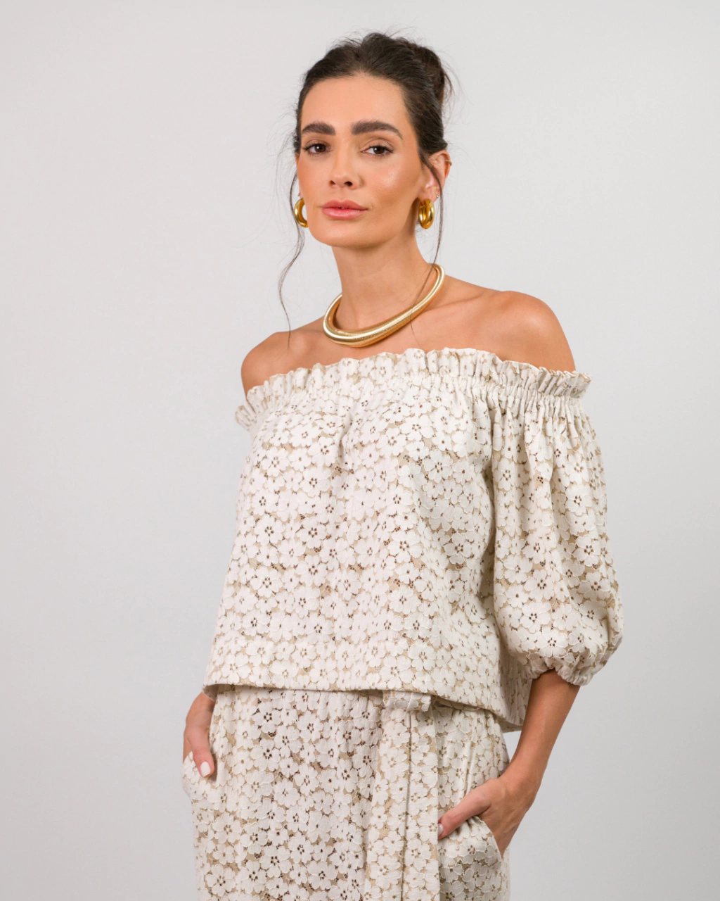 Blusa Jaqueline Descubra a Blusa Jaqueline, uma peça elegante feita em renda de algodão que une delicadeza e conforto. Seu design ombro a ombro com elástico no decote cria um volume sutil, ressaltando a feminilidade de forma sofisticada. Perfeita para compor looks refinados, combine com a nossa Calça Ivana ou Saia Hanna e realce sua elegância em qualquer ocasião.