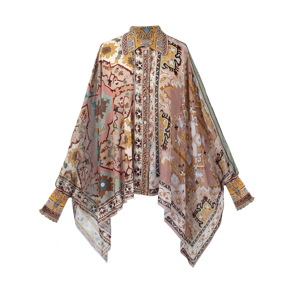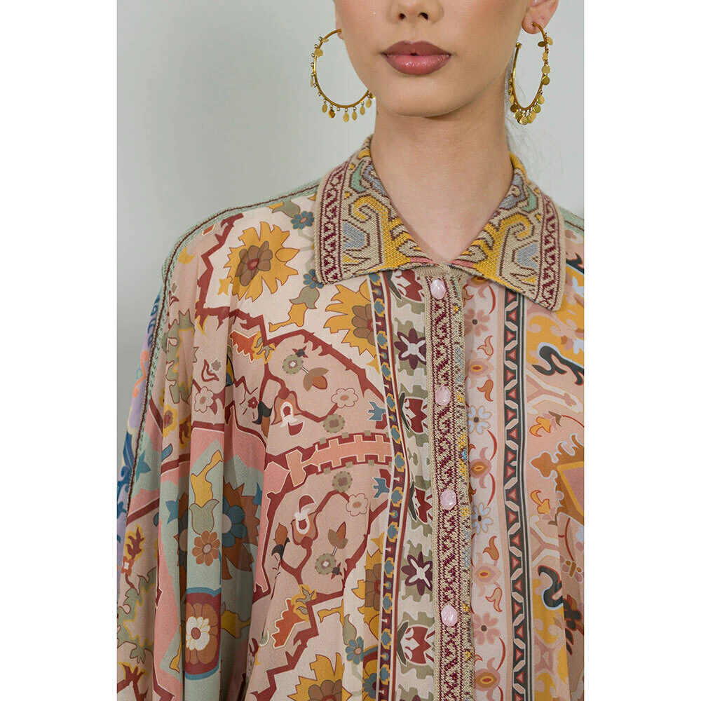 A Camisa Giovana é a união perfeita entre estilo e conforto. Com seu design amplo e mangas morcego, esta peça destaca-se pelo uso de lenços e acabamentos sofisticados na gola e vista em tricot.