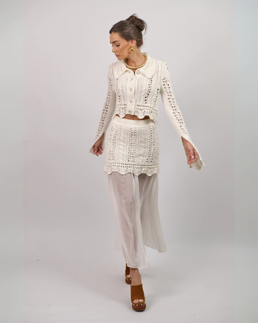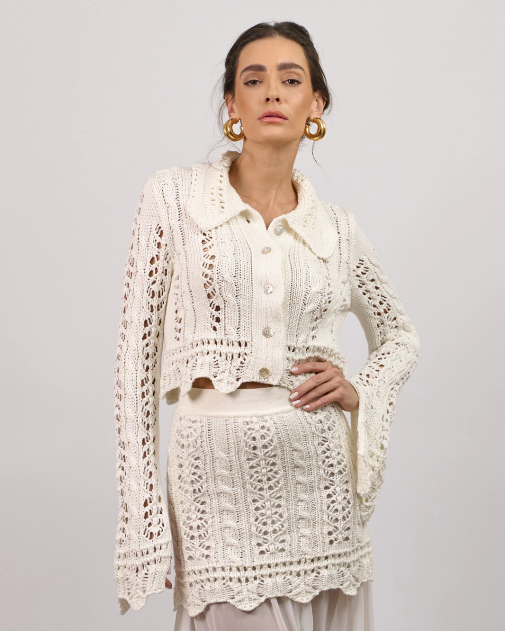 Descubra o Cardigan Clara, uma peça sofisticada em tricot rendado com botões delicados que trazem charme e leveza ao seu visual. Ideal para combinar com a saia Virgínia, ele cria um conjunto elegante e harmonioso, perfeito para ocasiões especiais ou para o dia a dia com um toque de requinte. Aposte nessa combinação para um look feminino e cheio de estilo.