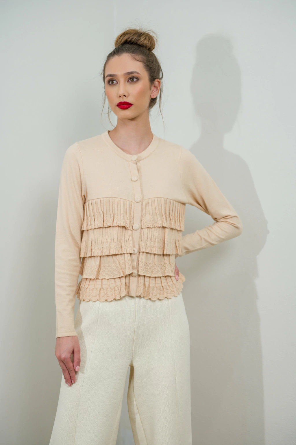 Apresentamos o Casaqueto Maura, uma peça leve e encantadora, perfeita para qualquer ocasião. Feito em viscose no tricot, este casaco se destaca pelo seu mix de babados que adiciona um toque de sofisticação ao seu visual.