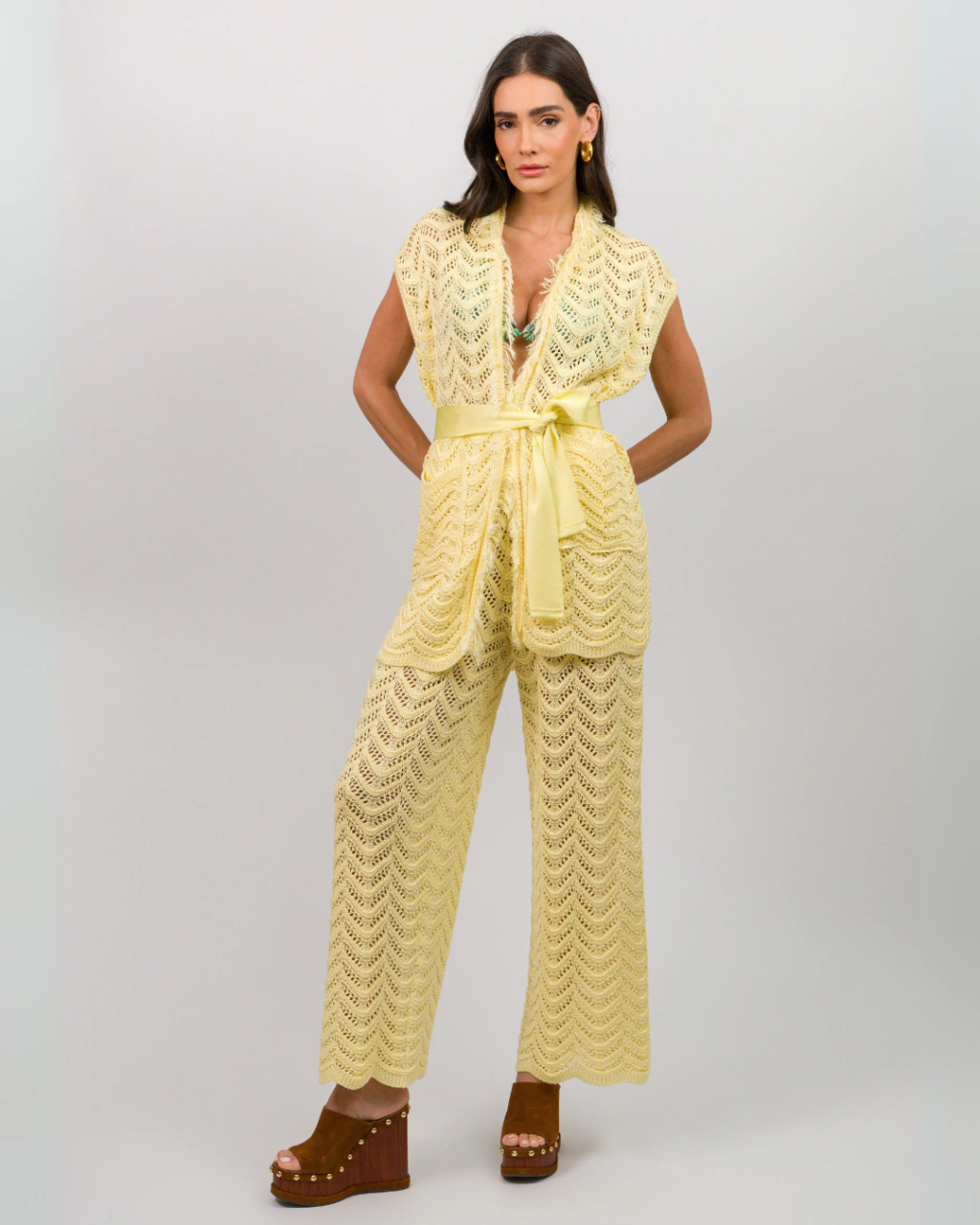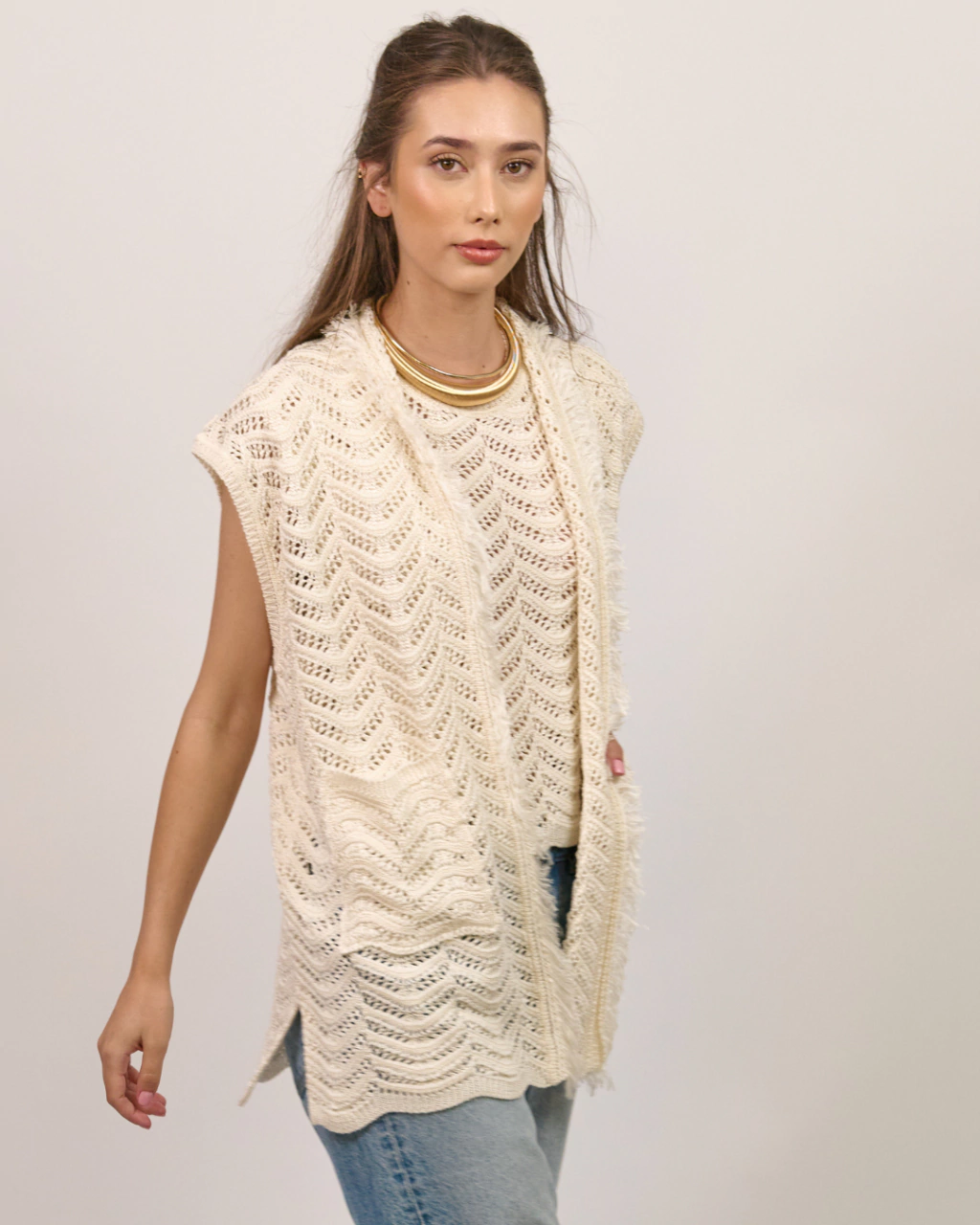 Apresentamos o Colete Ursula, uma peça sofisticada em tricot com trama rendada que exala delicadeza e estilo. Seu acabamento em franjas ao redor do decote confere um charme exclusivo, enquanto a faixa na mesma cor valoriza a silhueta, acinturando com elegância. Ideal para compor looks refinados, o Colete Ursula é a escolha perfeita para quem busca conforto com elegância.