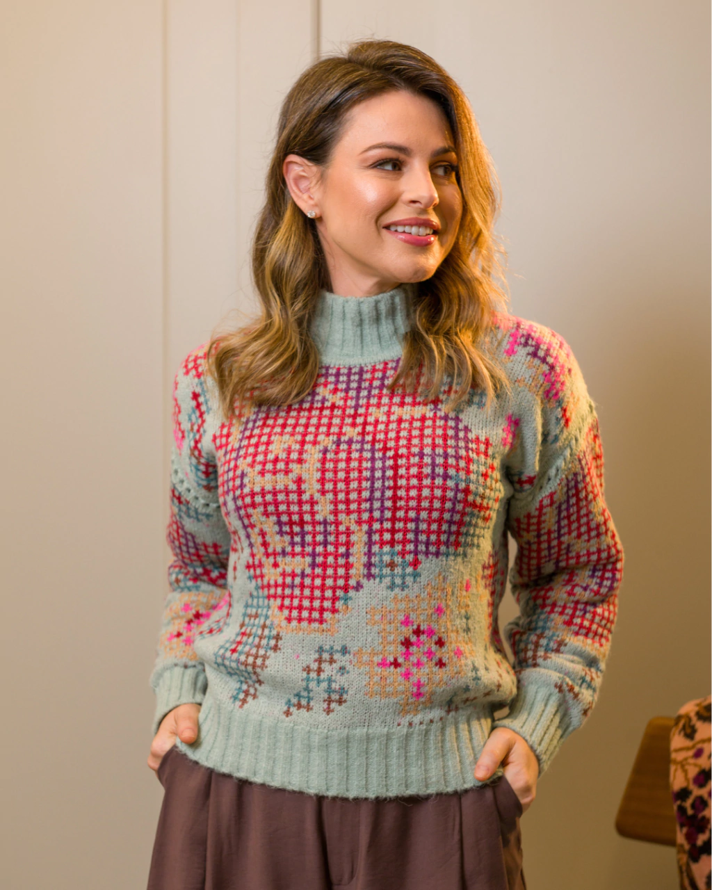 Max Pull Dalva: A peça que traz a beleza da natureza para o seu guarda-roupa. Este max pull é adornado com um delicado desenho de flores que imitam o ponto cruz, criando uma combinação de cores vibrantes que encantam.