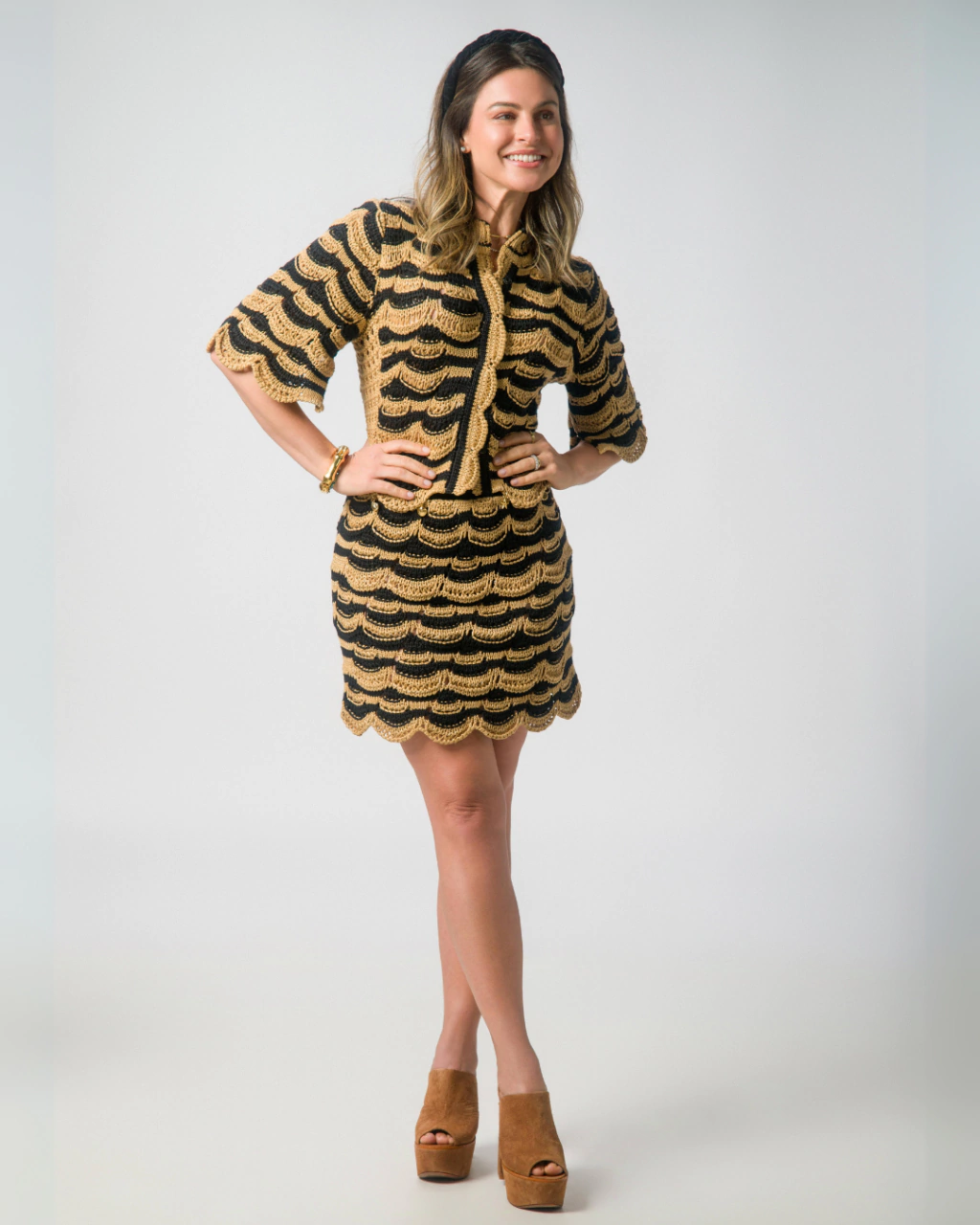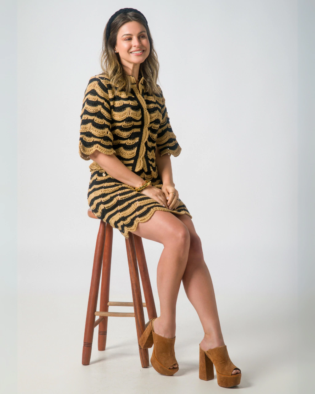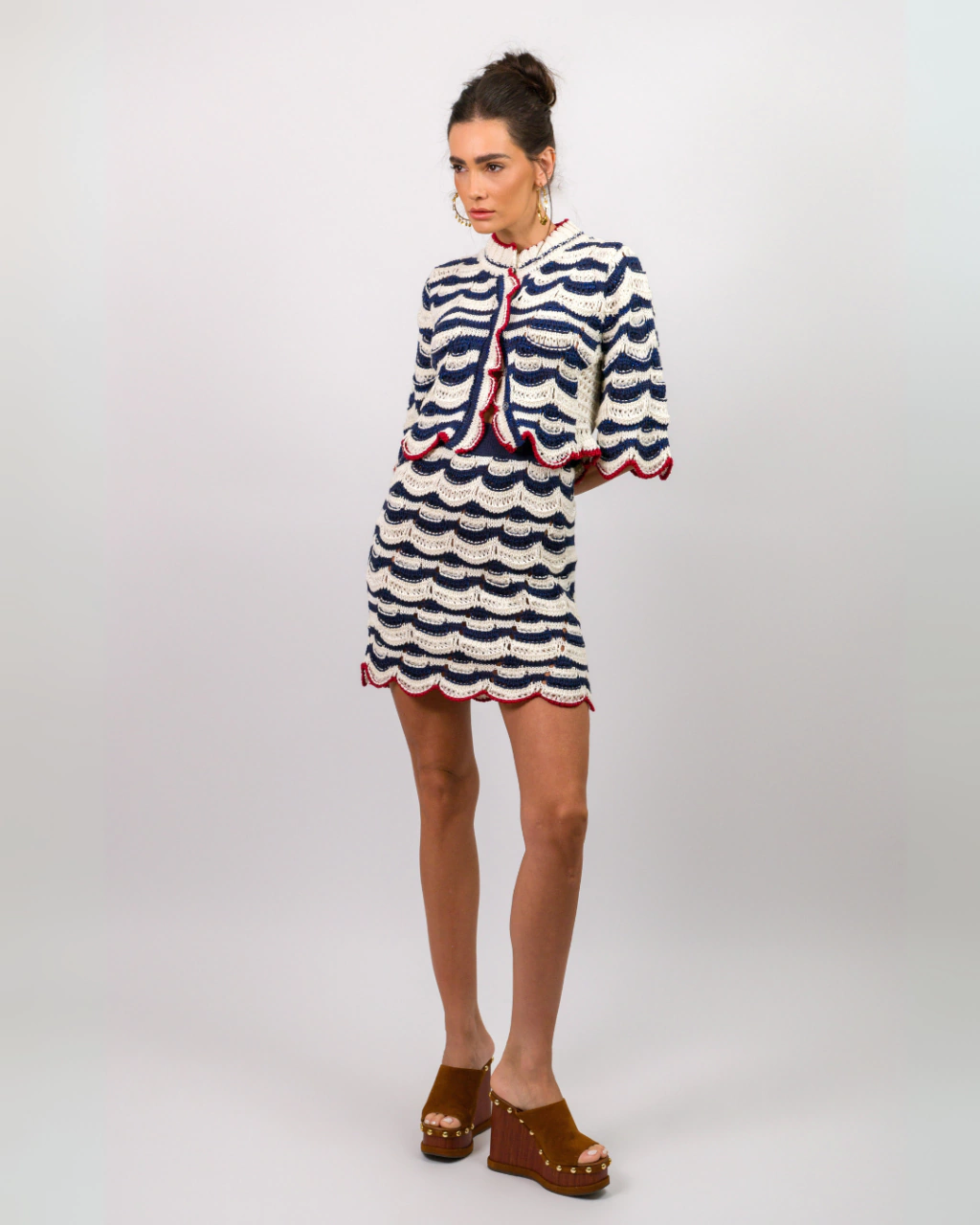 Saia Curta Layla - Elegância e conforto em uma só peça. Inspirada no estilo navy, esta saia de tricot ondulado exibe um caimento sofisticado que valoriza a silhueta. O cós com elastano garante ajuste perfeito e conforto ao longo do dia. Para um toque final de charme, a barra é adornada com delicados pingentes, conferindo exclusividade ao visual. Perfeita para quem busca estilo refinado com toque contemporâneo.