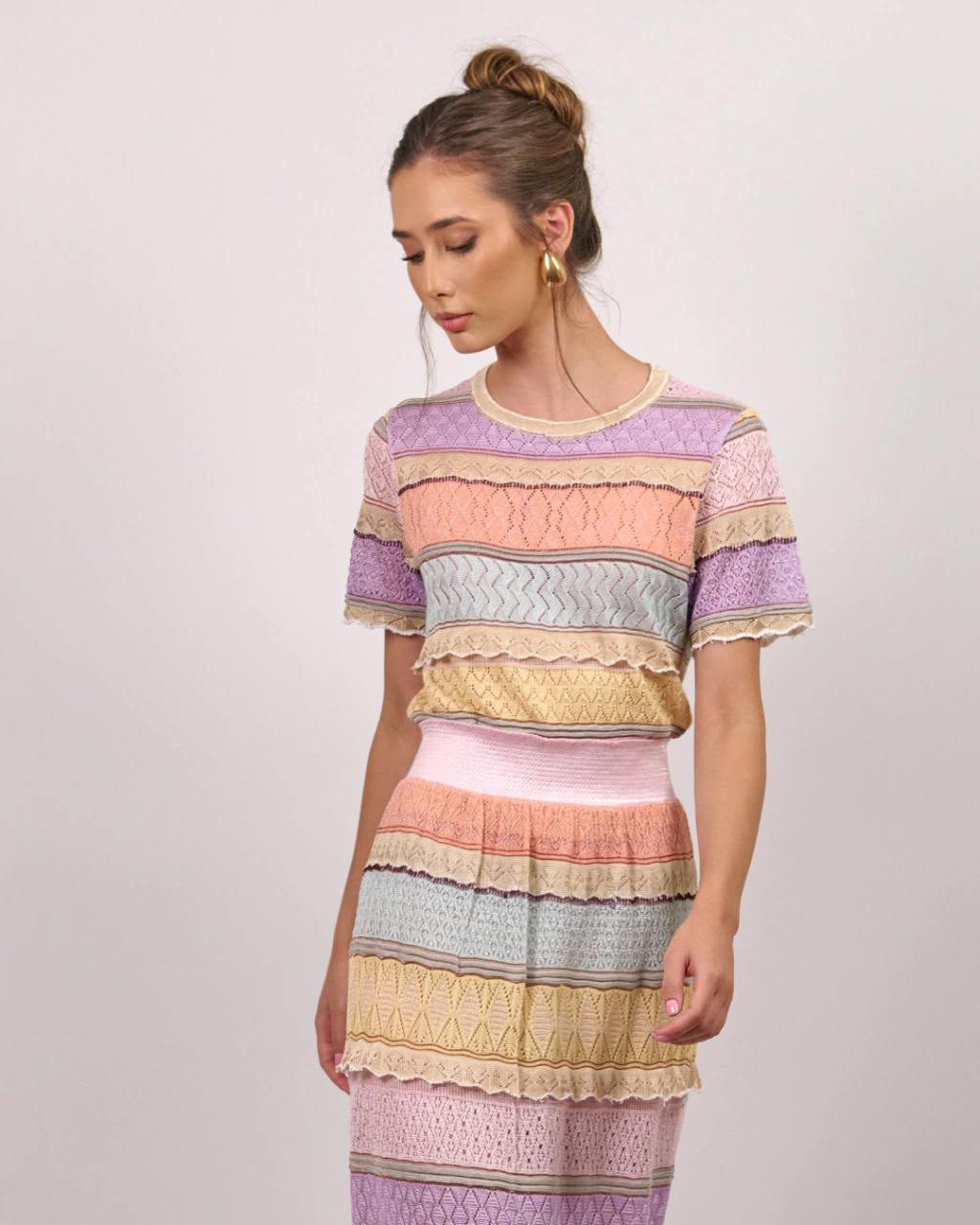 A T Shirt Heloíse é a escolha perfeita para quem busca elegância e conforto em uma peça única. Confeccionada em tricot com um delicado degrade de cores Soubert, destaca-se pelo seu ponto rendado que forma ondinhas sutis e sofisticadas.