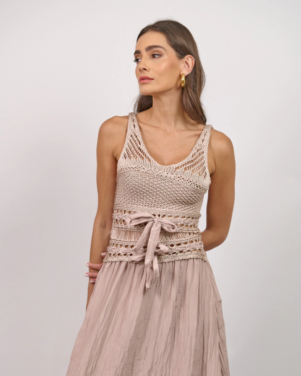 Apresentamos o Vestido Evelyn, uma peça que une delicadeza e sofisticação. Seu corpo em tricot proporciona conforto e ajuste perfeito, enquanto a saia de tecido confere leveza e movimento.
