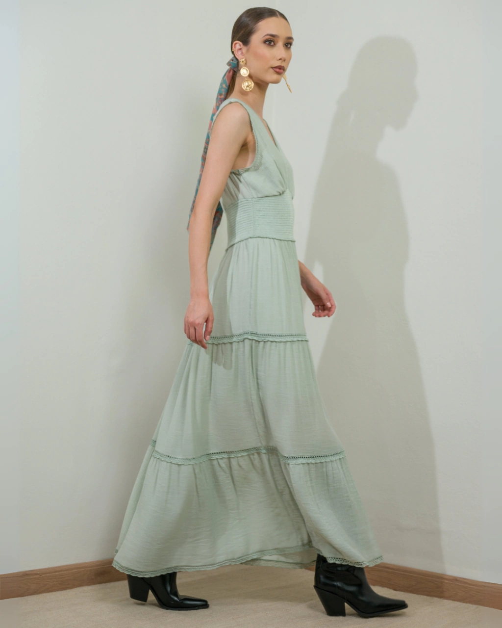 Com um decote V sofisticado e uma pala na cintura de tricô com elastano, o modelo acentua a silhueta feminina. A saia, com três camadas e entremeio de tricô intercalando os babados, traz um toque de charme e movimento ao look. O comprimento longo garante um visual chique e atemporal.